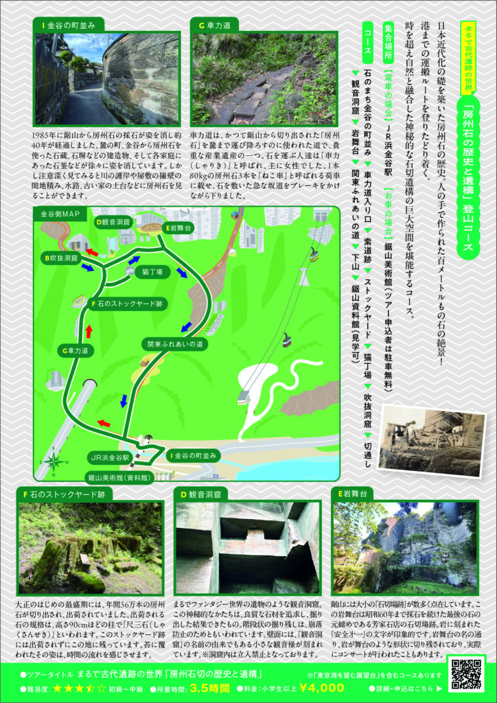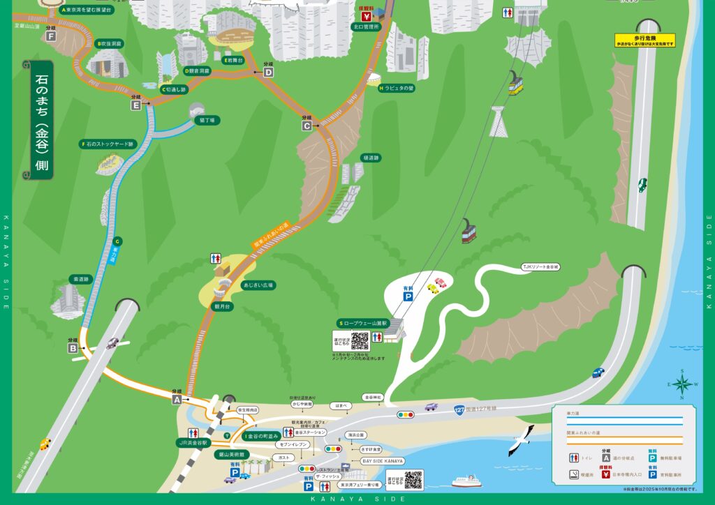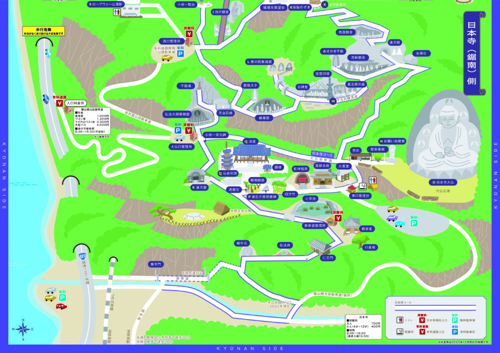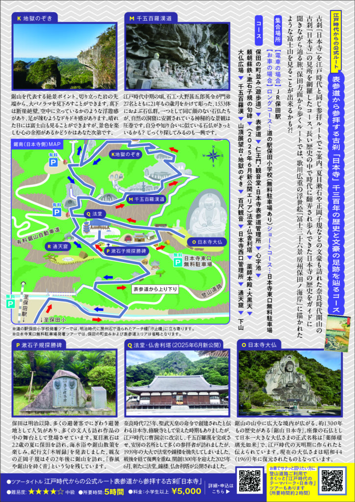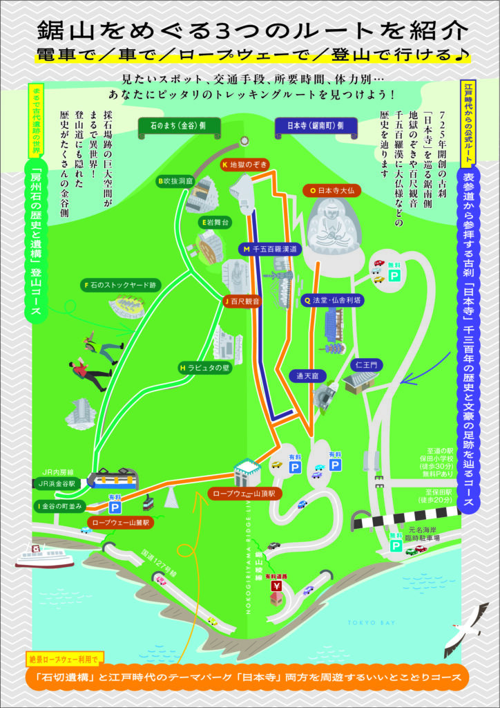 鋸山の北側と南側を網羅した、「究極の鋸山コースマップ」が完成しました!カラフルでとってもわかりやすいマップです。現在、鋸山美術館、浜金谷駅前鋸山案内所(週末9:00 – 10:00のみオープン)、道の駅保田小学校などで入手可能です。登山のお供に、ぜひご利用ください。